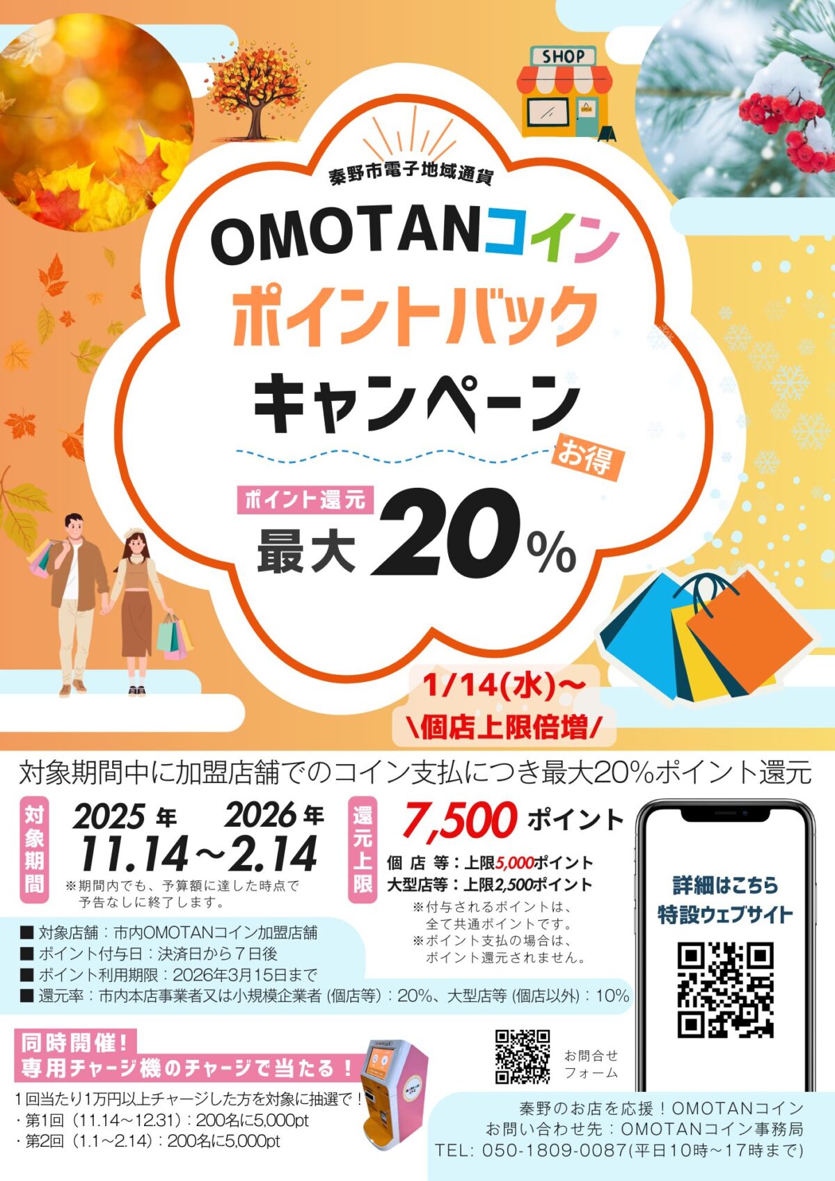 昨年11月14日より実施しております「OMOTANコイン」ポイントバックキャンペーンについて、地域経済のさらなる活性化を目指し、1月14日(水)より個店等(市内に本店がある事業者)の還元上限額を引き上げます。